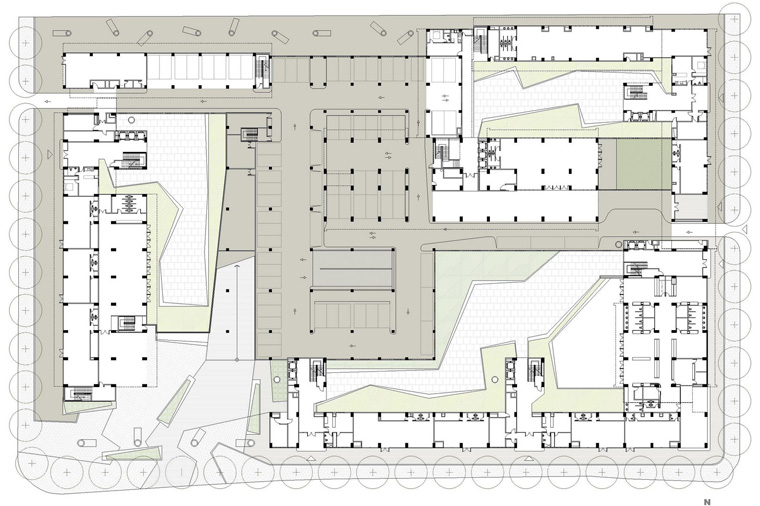 Espacio Público: Se concibe la ciudad como un lugar de encuentro. Se propone una calle con fachada continua, una galería techada y locales comerciales. Las fachadas varían en altura y densidad para crear una «unidad con variedad» que los habitantes puedan identificar. Se incluye una plaza elevada con canchas y áreas recreativas, aprovechando la cubierta de un estacionamiento subterráneo para reducir costos de excavación.