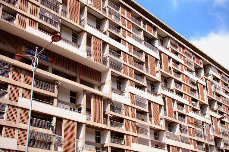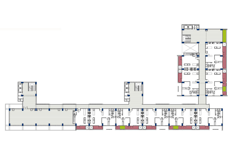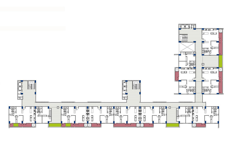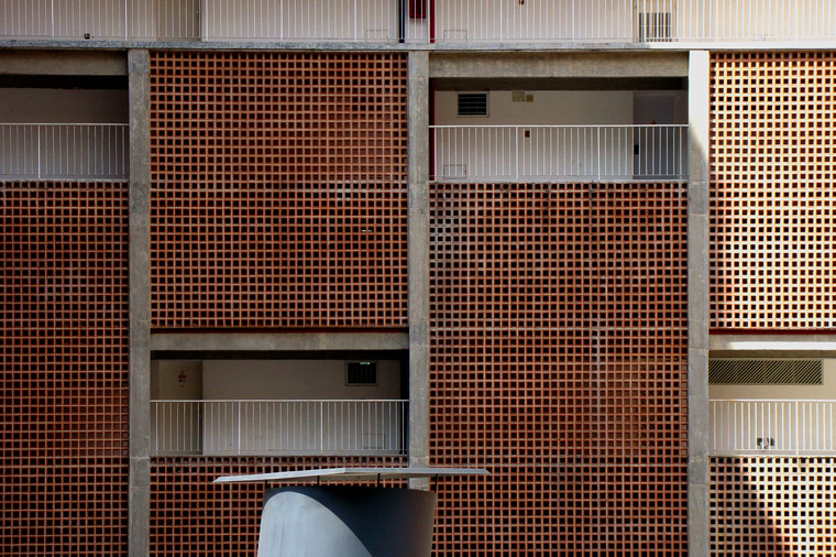 Interfaz 2, Espacio Semi-privado: Conocidos como «plazas aéreas» o «patios aéreos», estos espacios buscan ser un lugar de reunión para los vecinos. Además de fomentar la interacción social, su diseño garantiza la ventilación cruzada en los apartamentos.